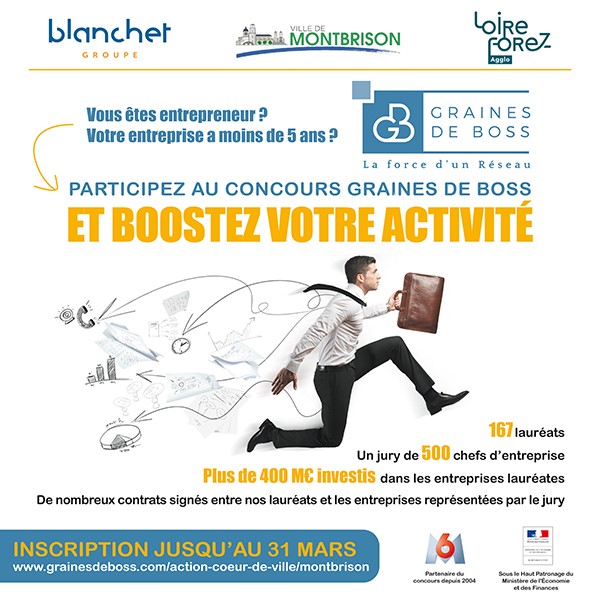 Créé en 2004, « Graines de Boss » est un concours national qui récompense le dynamisme des jeunes entreprises françaises grâce à un réseau de plus de 500 « mentors » chefs d’entreprises. Le concours est notamment relayé chaque année à la télévision dans l’émission « Capital » diffusée sur M6. Pour cette nouvelle édition, des partenariats inédits avec différentes villes, dont Loire Forez à travers Montbrison, sous le label « Graines de Boss Territoire » a été créé.